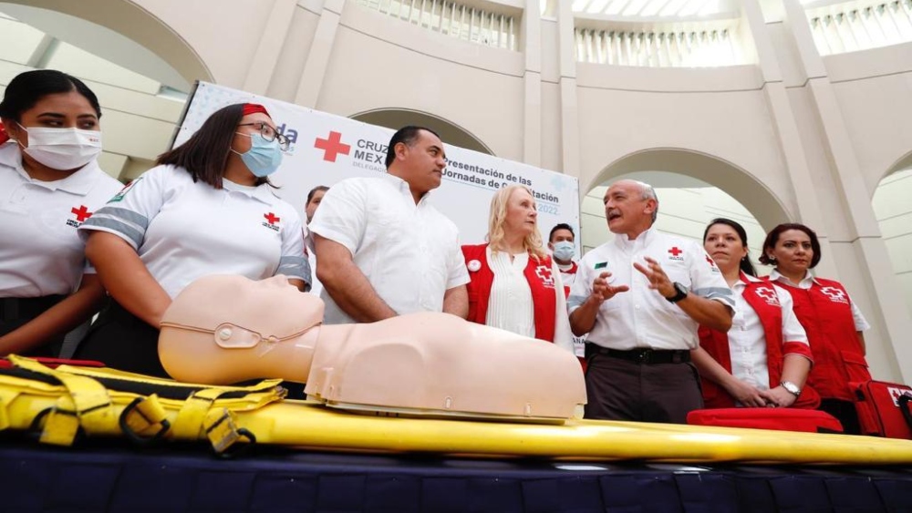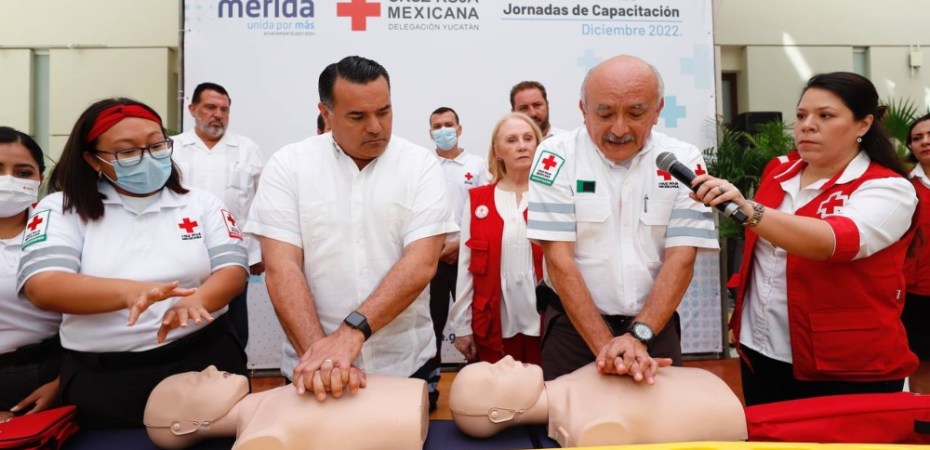 El alcalde Renán Barrera Concha y la Cruz Roja Mexicana presentaron las jornadas de capacitación en primeros auxilios, dirigidos a los prestadores de servicios turísticos y comerciales, para fortalecer las acciones en materia de prevención y atención oportuna ante una emergencia.