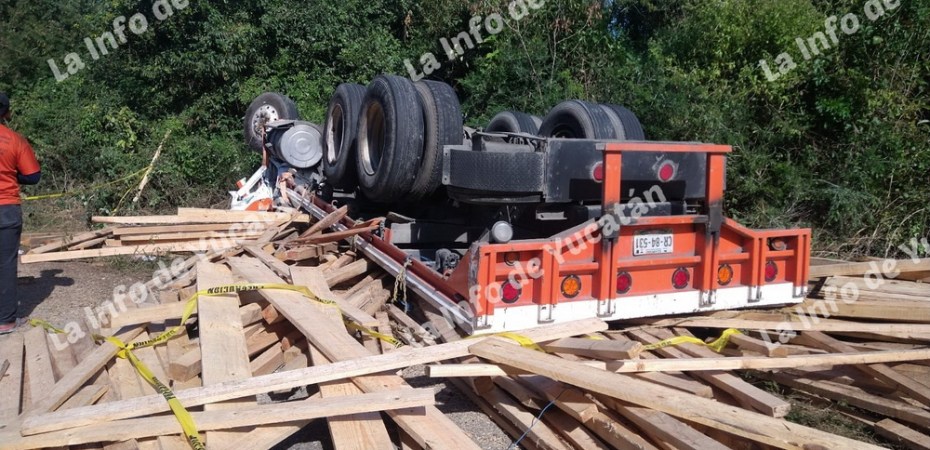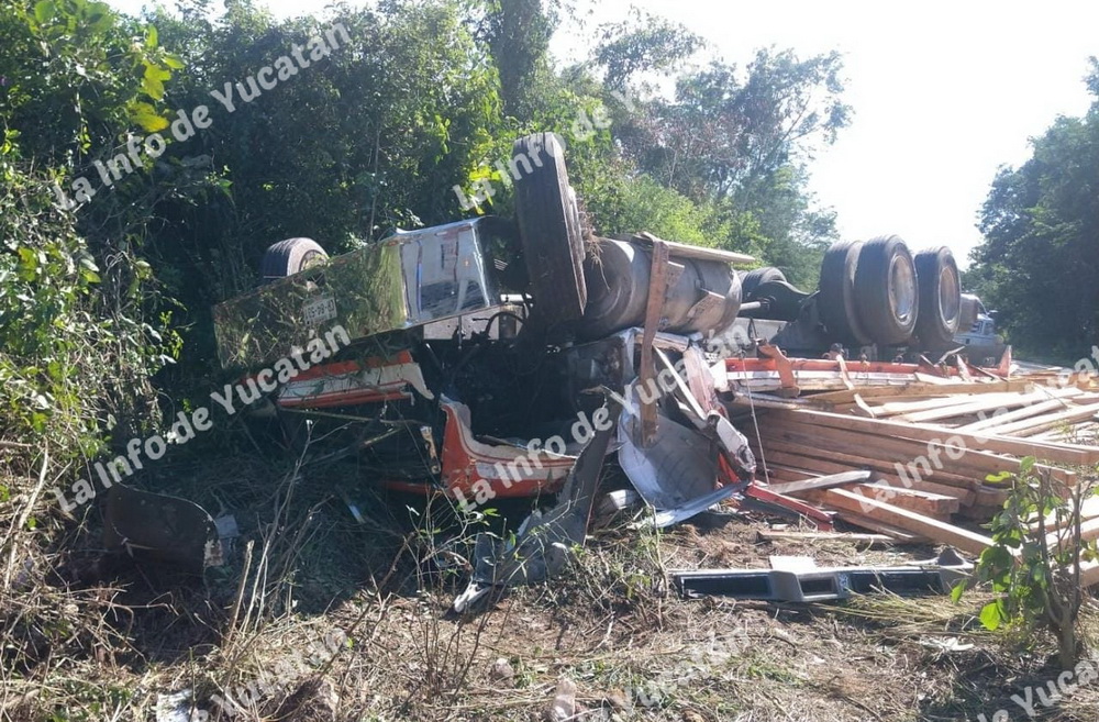De cabeza quedó un tractocamión cargado con tablas de madera que se accidentó esta mañana en el tramo Chaksinkín-Peto de la carretera Mérida-Chetumal. El conductor resultó gravemente herido y la gente de la zona acudió a “rapiñar” o más bien, robar las tablas.