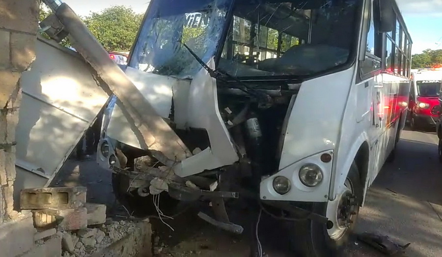 Daños aparatosos y cuatro personas lesionadas dejó el choque de un autobús contra un muro ocurrido la tarde de ayer en la colonia Xoclán Carmelitas, accidente que además arrancó un poste de madera y derribó una señal de nomenclatura.