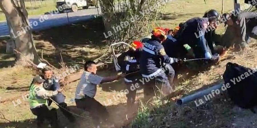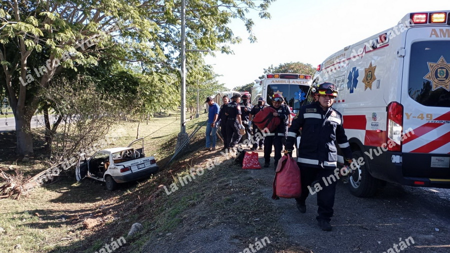 Bomberos y paramédicos rescataron a un hombre con sobrepeso que quedó atrapado en su vehículo Tsuru, luego de que éste cayó en la hondonada central del Anillo Periférico de Mérida, cerca de la salida de la calle 42 sur.