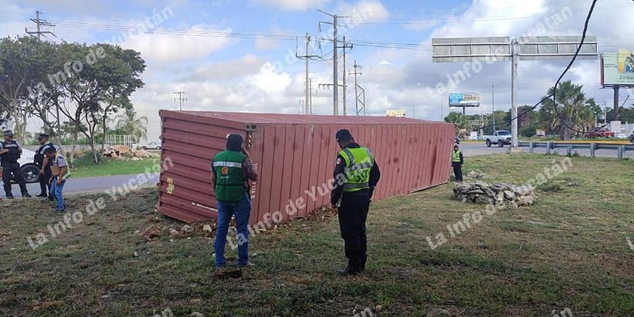 Iba con exceso de velocidad un trailero sobre la carretera Mérida-Progreso, y por ello, justo en el entronque para ingresar al Periférico de la capital yucateca, la caja trasera del vehículo se le arrancó y cayó de lado en un área verde.