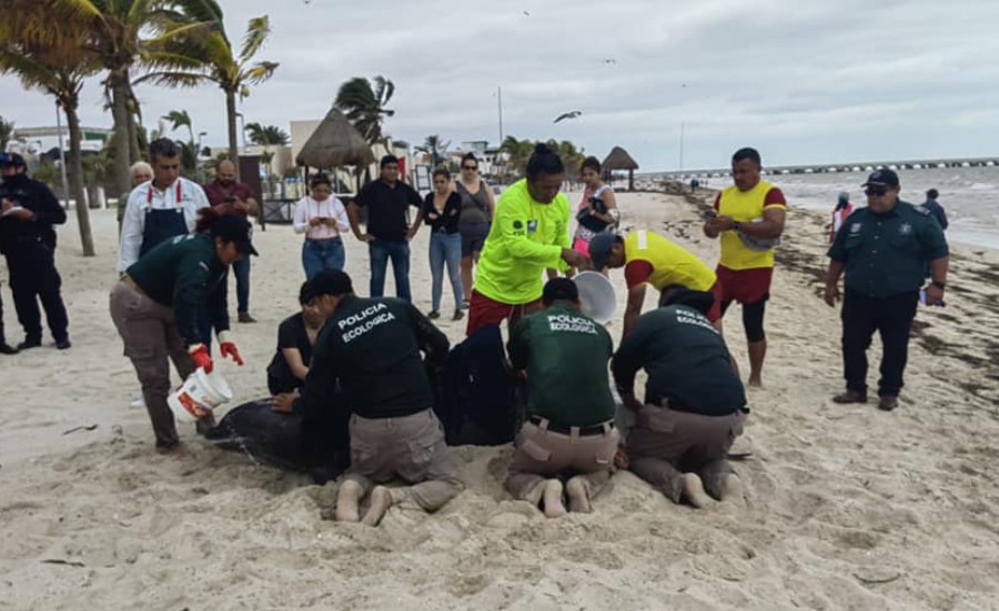 Se dio la alerta de inmediato, y acudieron elementos de la Policía Ecológica y los salvavidas de Blue Flag que unieron esfuerzos para mantener estable al mamífero, evitando que se secara y atendiéndolo lo mejor posible en espera de la llegada de las autoridades respectivas.