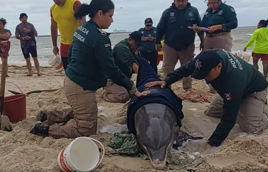 La Policía Ecológica del puerto de Progreso, en coordinación con salvavidas de Blue Flag atendieron de urgencia a un delfín con vida que quedó varado en la playa, y al cual mantuvieron a salvo hasta que llegaron las autoridades que se harían cargo del mamífero.