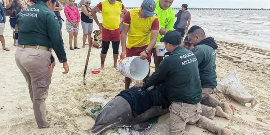 La Policía Ecológica del puerto de Progreso, en coordinación con salvavidas de Blue Flag atendieron de urgencia a un delfín con vida que quedó varado en la playa, y al cual mantuvieron a salvo hasta que llegaron las autoridades que se harían cargo del mamífero.
