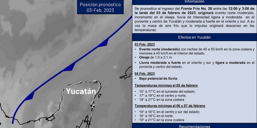 Este viernes 3 de febrero por la tarde ingresará a Yucatán el frente frío número 28, que originará norte, incremento en el oleaje, lluvias de moderadas a fuertes en el sur y oriente del estado, y de ligeras a moderadas en el poniente y centro.