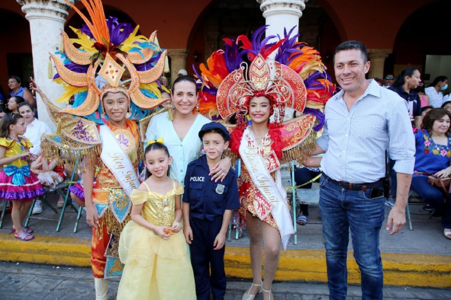 La presidenta del DIF Municipal, Diana Castillo Laviada acompañada de sus hijos Daniela y Renán, y de los reyes del carnaval, Shannon Harris Nic, “Shannon I” y Eddier Rivero Herrera “Eddier I”, disfrutó de los alegres bailes y los vistosos trajes multicolores con que los niños y las niñas desfilaron al ritmo de música pegajosa ante la mirada divertida de miles de familias que desde temprano se dieron cita para disfrutar del desfile infantil de comparsas.