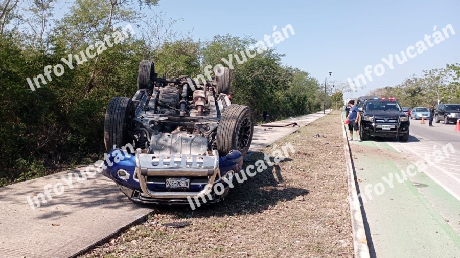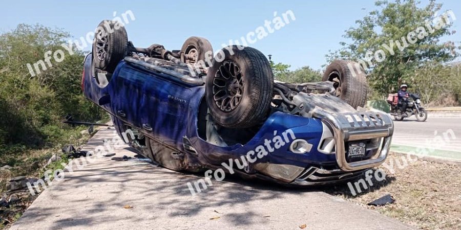 Llantas al cielo quedó una camioneta Límited cuya guiadora perdió el control del volante mientras avanzaba sobre la avenida que lleva de la carretera Mérida-Progreso hacia el fraccionamiento Las Américas. Ella tuvo que ser atendida por paramédicos por los golpes que se llevó en toda su humanidad.