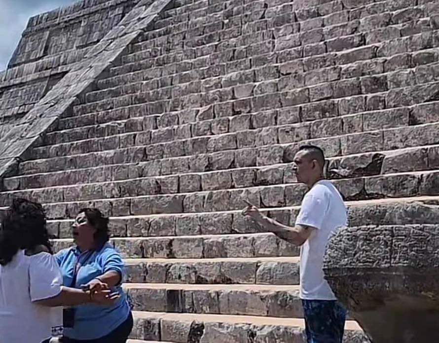 También se aprecia a una mujer que intenta defender al hombre del personal de la zona arqueológica, mientras las demás personas molestas le arrojan agua al hombre.