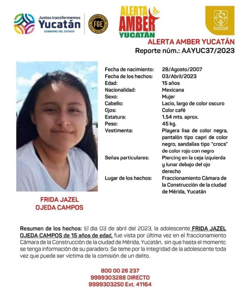 La menor Frida Jazel Ojeda Campos., de 14 años, reportada como desaparecida en Mérida desde el día 3 de este mes, fue localizada en un predio particular de Cancún, Quintana Roo.