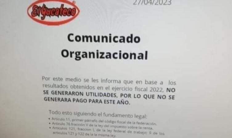 Dicho comunicado fue difundido en redes sociales, causando molestias y comentarios en contra de la empresa, y fue este viernes que los trabajadores se plantaron a las afueras de “El Yucateco”, exigiendo el pago de sus utilidades de 2022, tomando en cuenta lo ya mencionado: que la misma empresa habló en meses pasados de su aumento en ventas, y que se realizarán ampliaciones.
