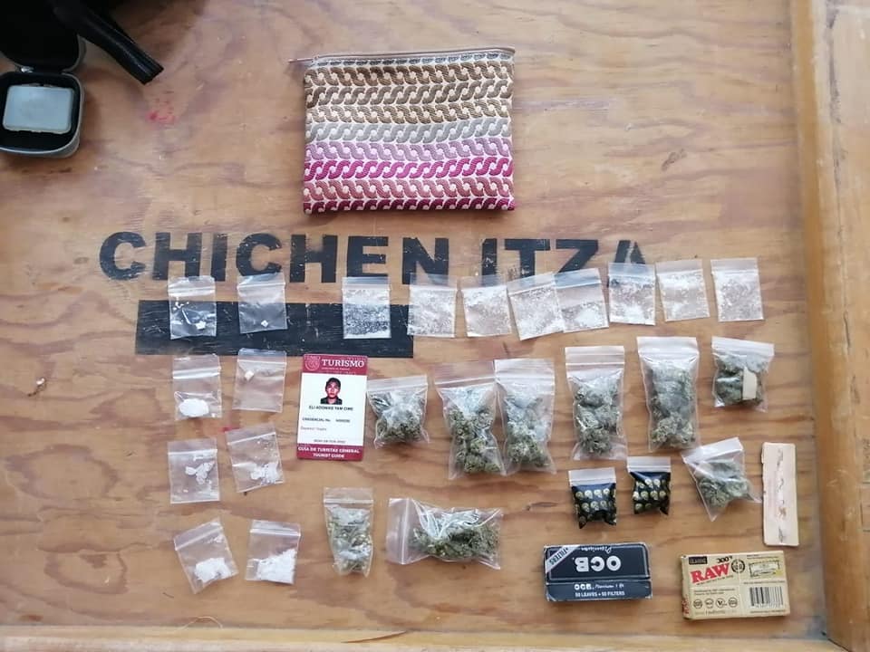 Elementos de la Guardia Nacional arrestaron a Eli Adonías Y.C., quien era guía de turistas en la zona arqueológica de Chichén Itzá, pero fue descubierto en posesión de diferentes tipos de drogas que ofrecía a los visitantes nacionales e internacionales.
