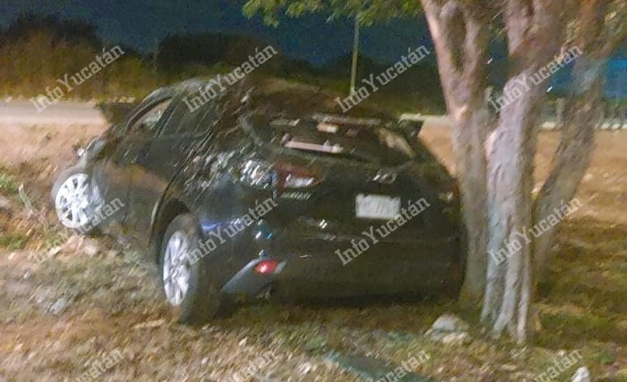 Dos vehículos se fueron a la cuneta central del Anillo Periférico de Mérida, luego de que el guiador de uno de ellos chocara por alcance contra el otro, causando la aparatosa salida de camino que incluyó la volcadura del auto responsable del accidente.