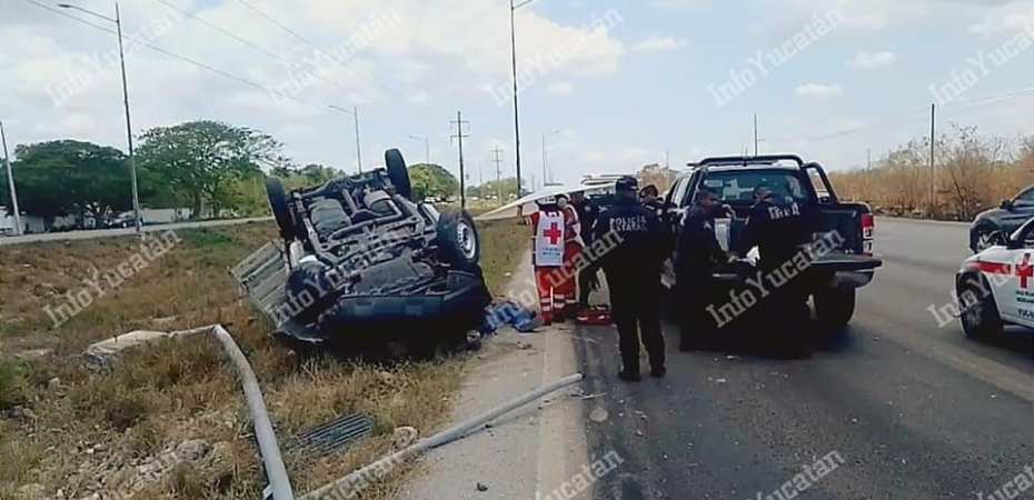 Fue poco después del mediodía cuando se dio el primer hecho. Un hombre manejaba una camioneta sobre la vía Mérida-Progreso, de norte a sur, y a la altura del kilómetro 22 perdió el control del volante y se fue a la izquierda hasta chocar y derribar un poco de alumbrado público. El impacto hizo que el coche quedara volteado por completo.