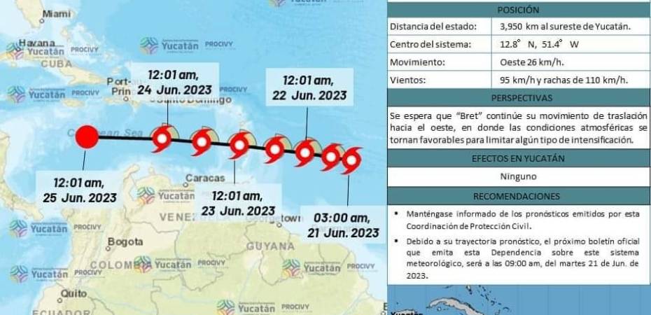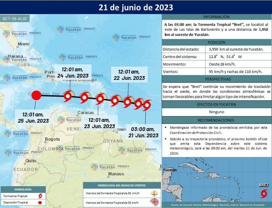 A pesar de que se localiza a casi 4 mil kilómetros de Yucatán, y que por el momento no representa peligro, las autoridades mantienen bajo vigilancia a la tormenta tropical “Bret” que avanza con dirección oeste desde el Océano Atlántico.