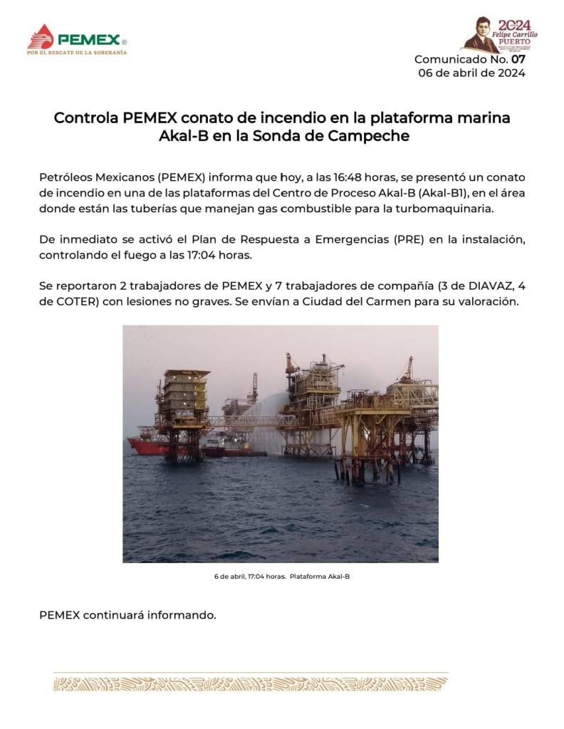 “Se activó un plan de respuesta a emergencias en la instalación (…) 2 trabajadores de Pemex y 7 de compañía (3 de DIAVAZ y 4 de COTER) tuvieron lesiones no graves, y se envían a Ciudad del Carmen para su valoración.