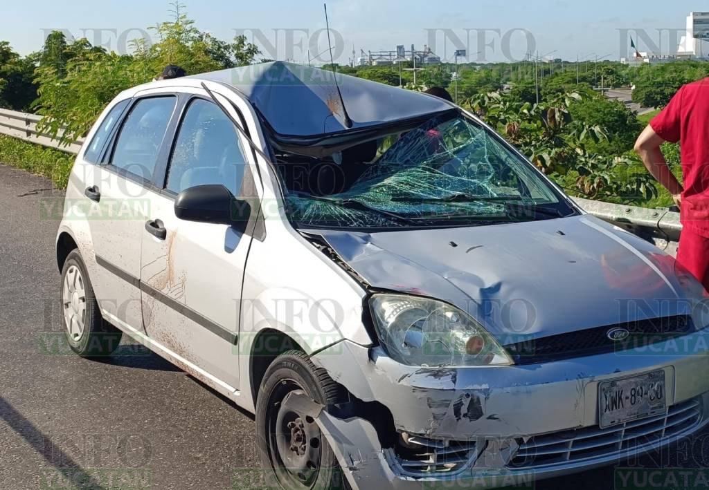 El guiador de este coche aceleró y escapó sobre el puente de la salida a Celestún, pero fue alcanzado por otros guiadores que le cerraron el paso y lo obligaron a detenerse, pidiéndose apoyo policiaco.