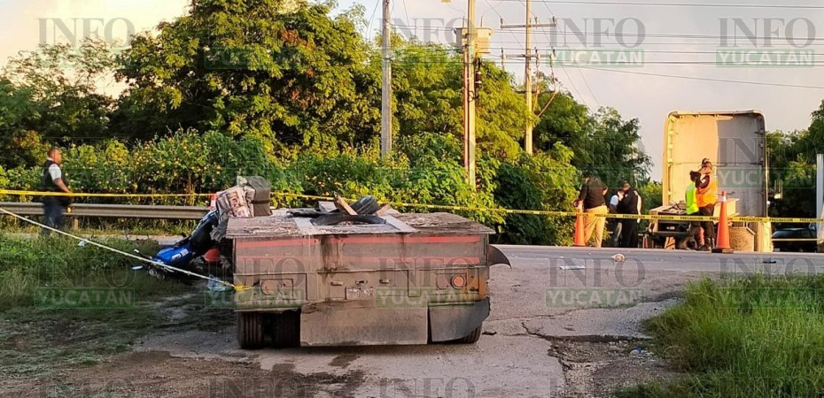 Dos repartidores de periódicos en moto se estrellaron contra la plancha de un tráiler que salía de la calle 26-A de Motul para incorporarse a su Anillo Periférico, quedando seriamente lesionados, mencionándose que incluso sufrieron amputación de piernas.