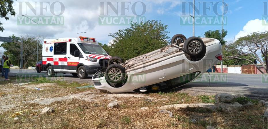 Llantas arriba, totalmente de cabeza, quedó un vehículo que sufrió un accidente la mañana de hoy en el Anillo Periférico de Mérida, a la altura del kilómetro 14, entre los puentes de las salidas de Mulchechén y Kanasín, dejando como saldo una persona lesionada, además de daños materiales.